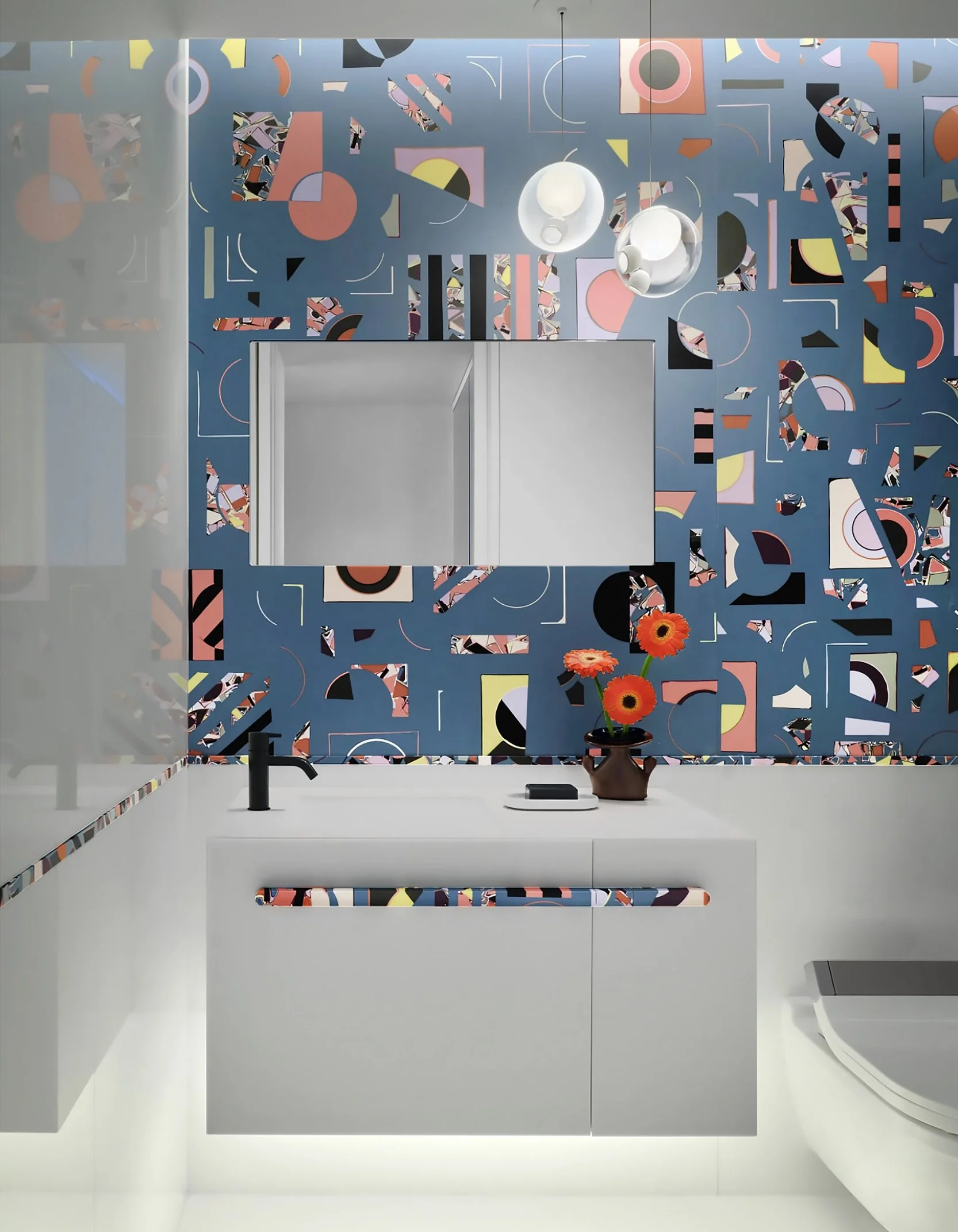 Our largest project to date, the 11ft wall consists of three panels with a flush-mount mirror above the sink. Extending from the MetaMATERIAL wall a thin chair rail molding, running between the composite-clad walls, wraps the rest of the bathroom and merges with a custom knee wall countertop situated behind the bathtub. As a final detail, the sink cabinet is fitted with custom MetaMATERIAL cabinet pulls.