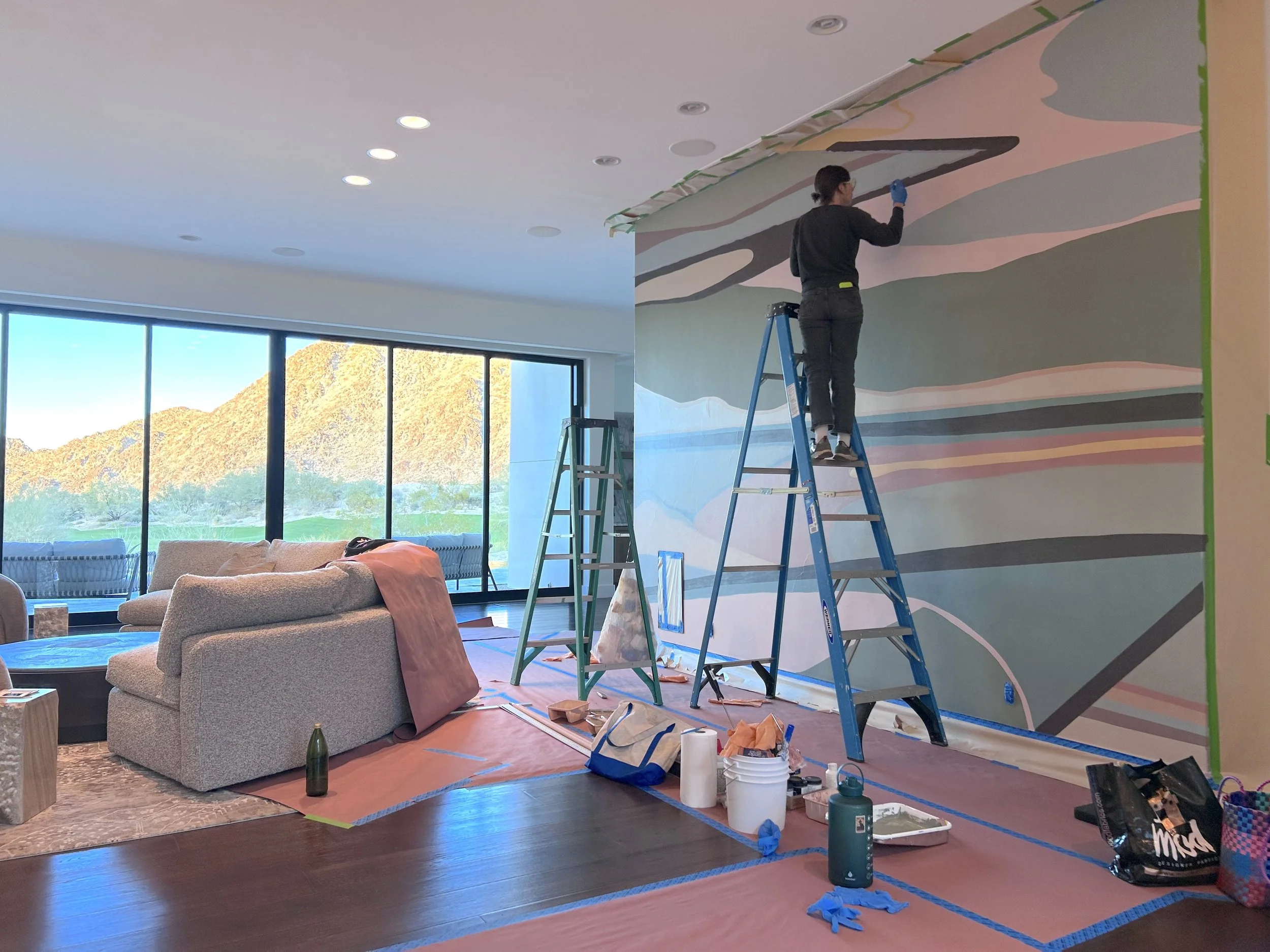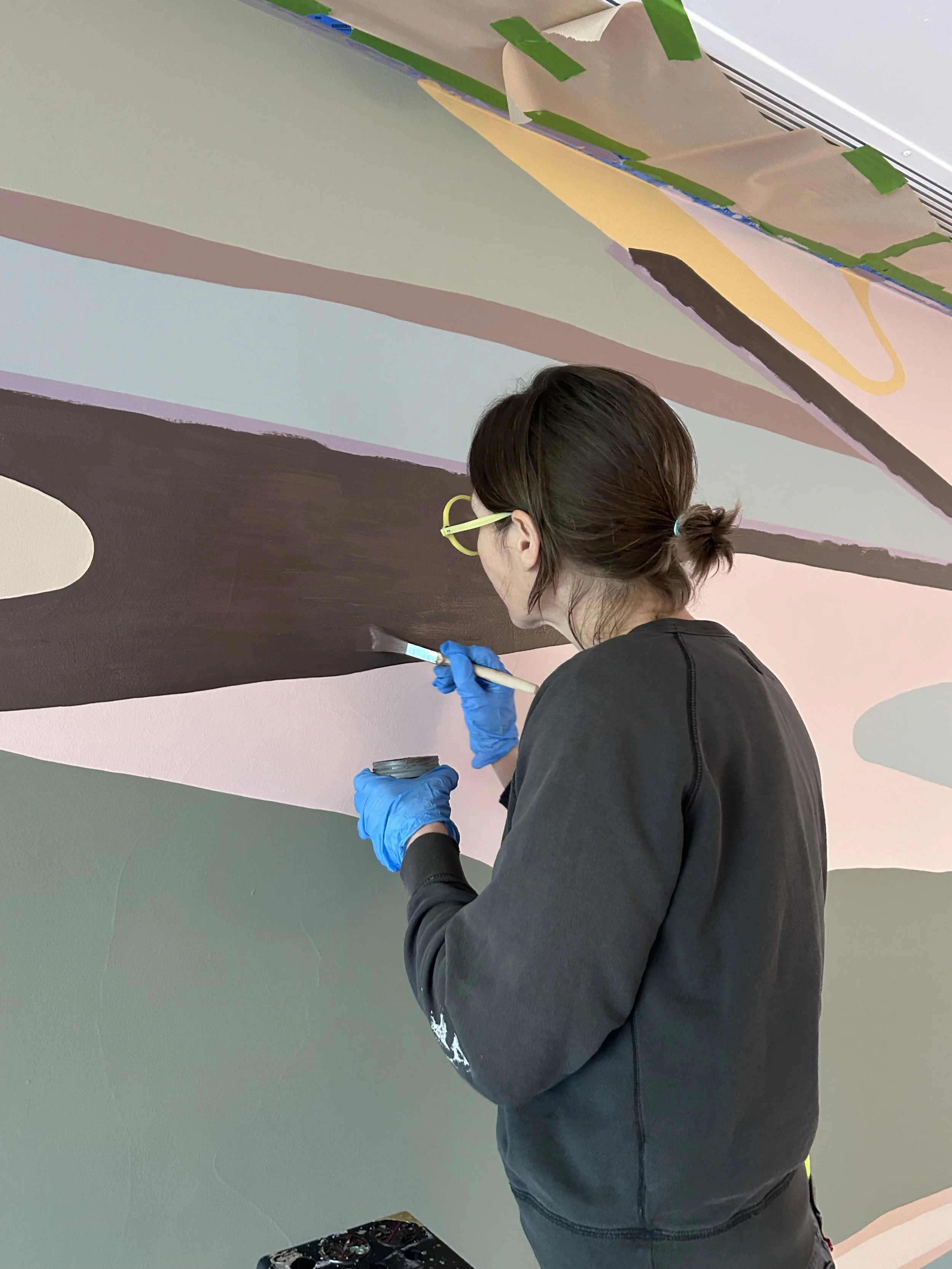 Painting the revised mural design with hand-curated colors